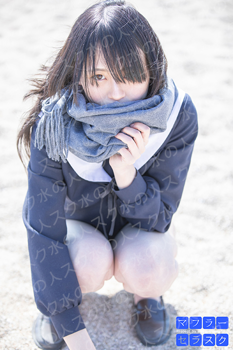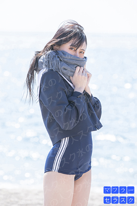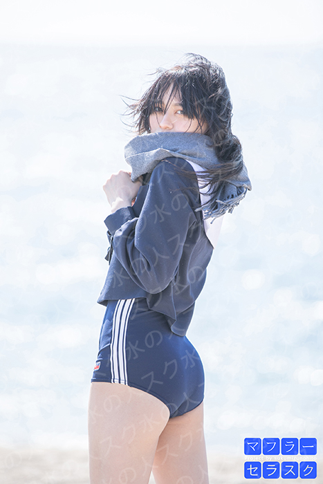 寒い海、マフラーを巻いて佇むセーラー服×スクール水着の少女。